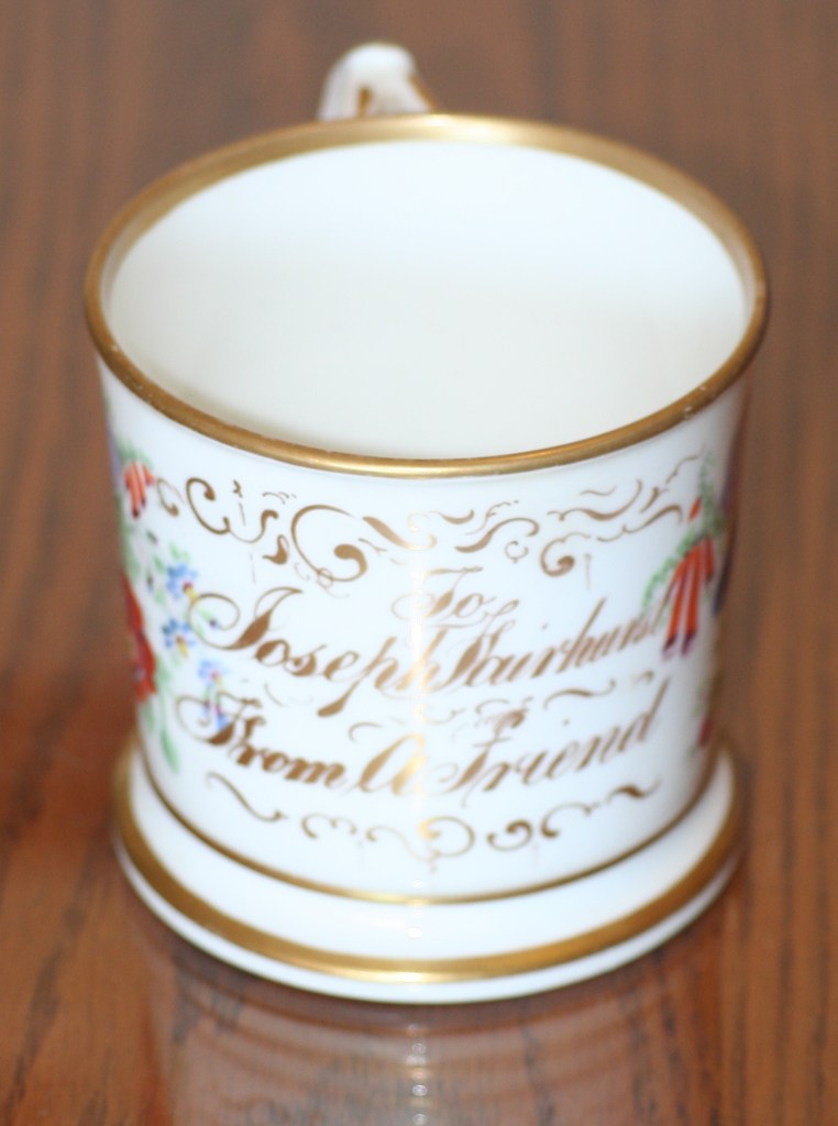 1. Joseph Fairhurst inscribed cup, personalized mug from unidentified manufacturer, in collection of Robert Frederick Gaede, ca. 1840-1885; privately held by Mr. Gaede, Calgary, Alberta, 2024. White cup with gold trim, green and red decoration and inscribed, “To Joseph Fairhurst From A Friend,” received by Mr. Gaede from relatives while visiting Widnes, Lancashire in October, 1970.