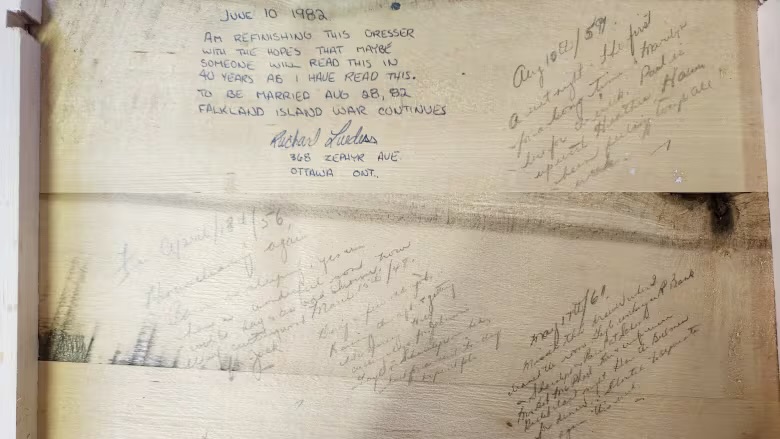 Recently, while refinishing a piece of furniture, Tim Skelly of Lanark, Ontario, discovered a series of handwritten notes on the underside of a drawer. Previous owners of the piece had left messages dating from 1942 to the most recent inscription from 1982.